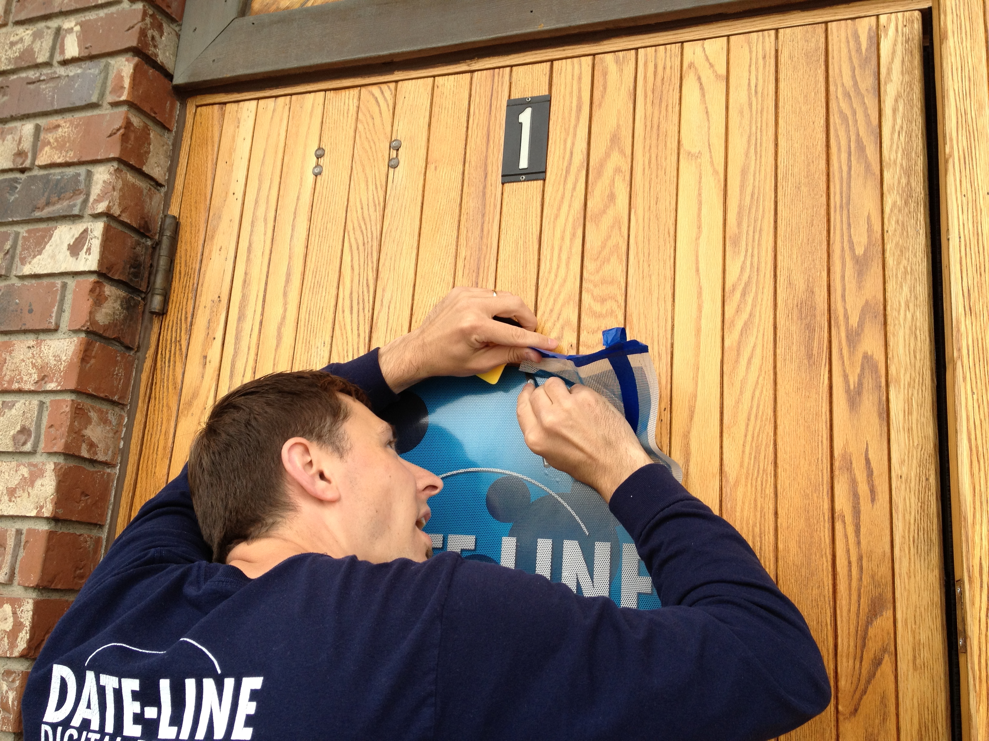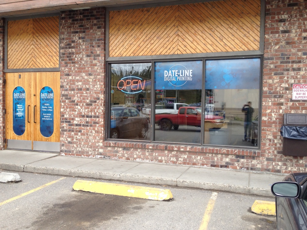 The installation began by dressing our front doors in this material and using the space to post our logo, hours, and web site address for folks who may need to send us an order after hours. (see image at the top of this post)